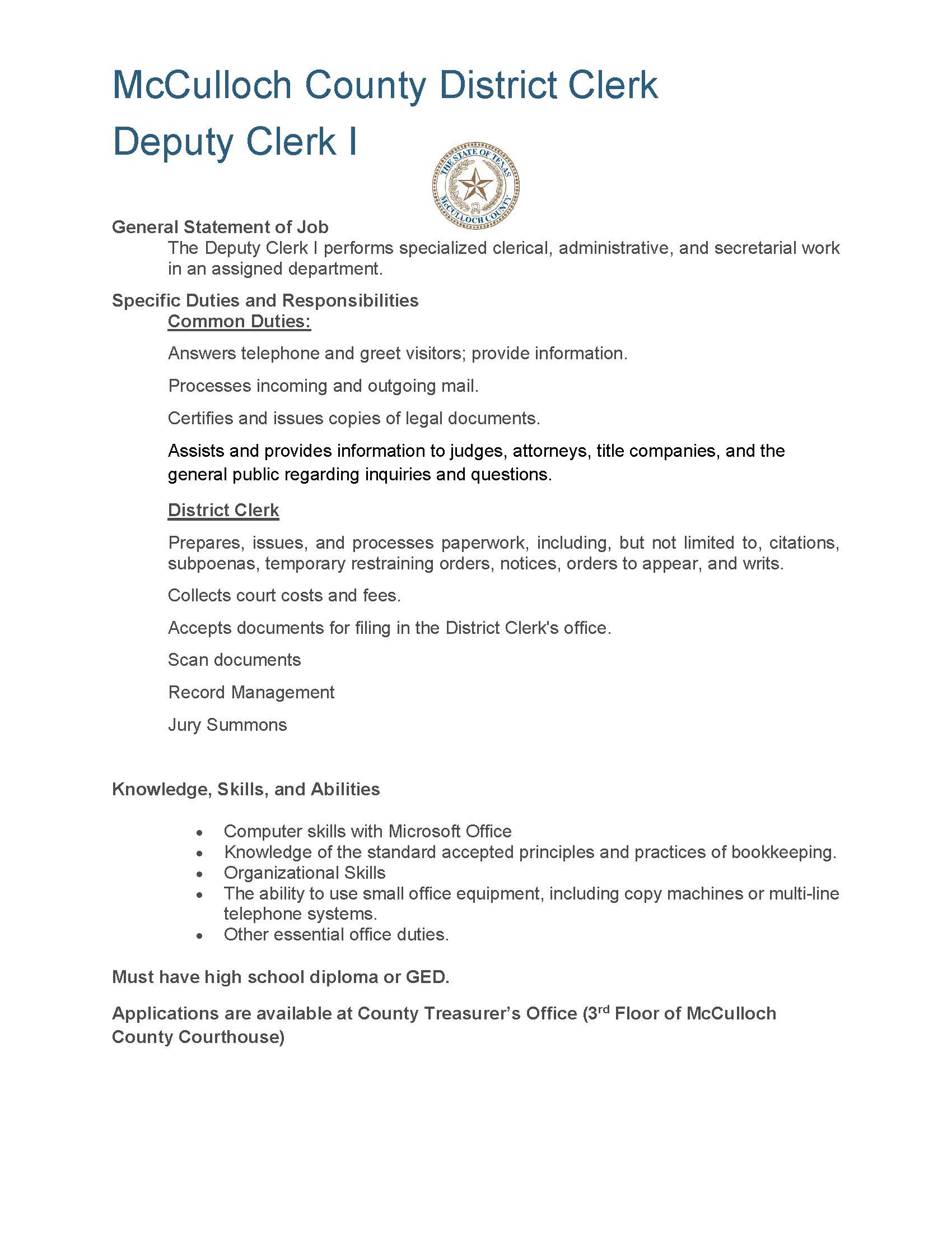 McCulloch County Tax Assessor-Collector's Office is seeking a Part Time Employee to perform tasks related to Motor Vehicle Registration, Voter Registration, Texas Park & Wildlife Registration. This individual must be able to perform each essential duty satisfactorily. Must complete TxDMV training modules. The requirements listed below are representative of the knowledge, skill, and/or ability required.